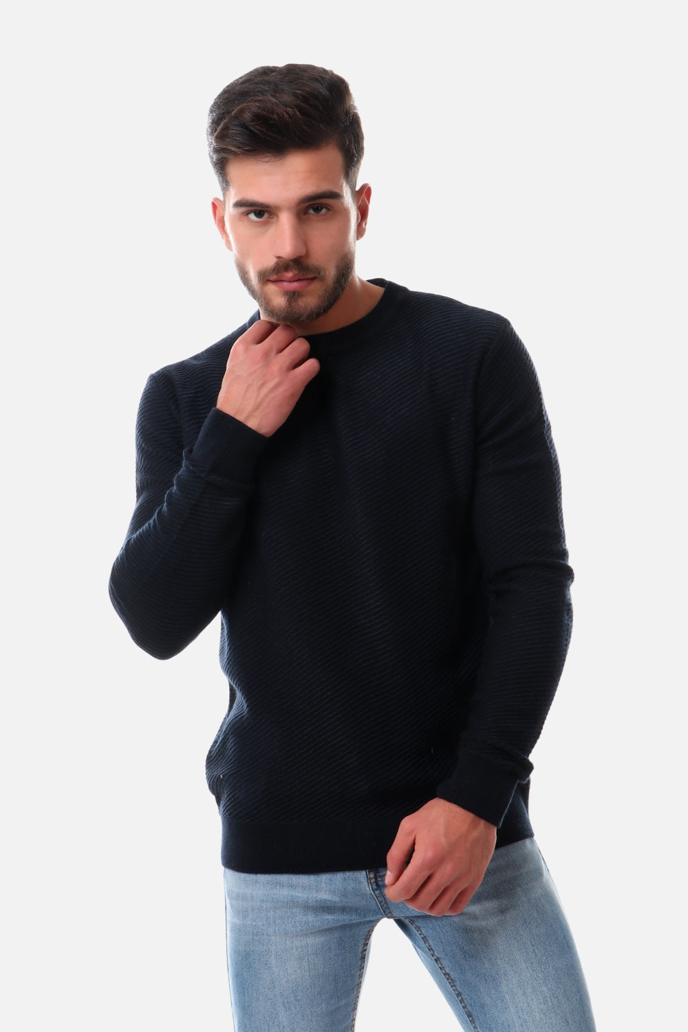 Knitted Pullover With Ribbed Hem -Navy